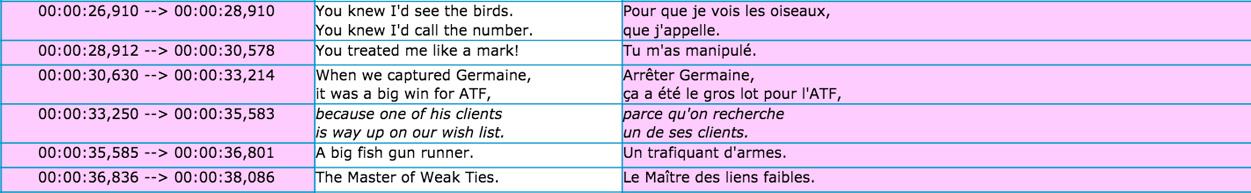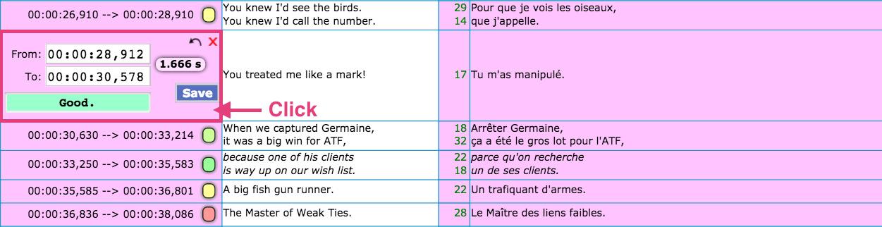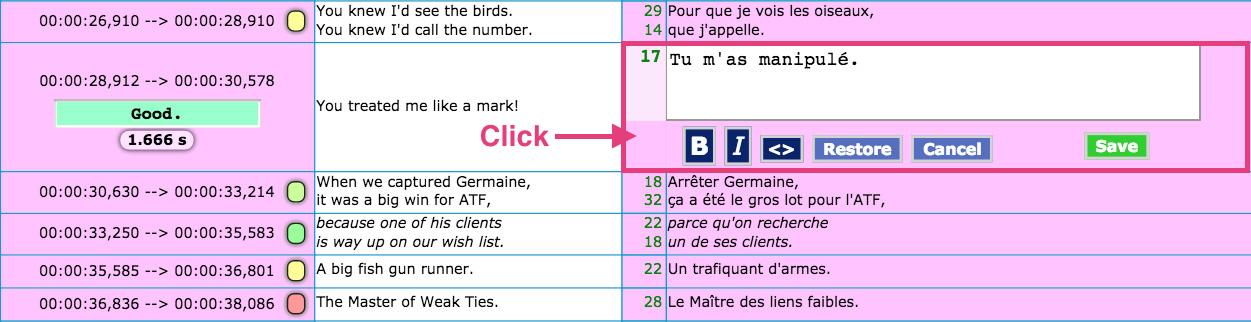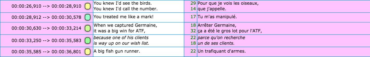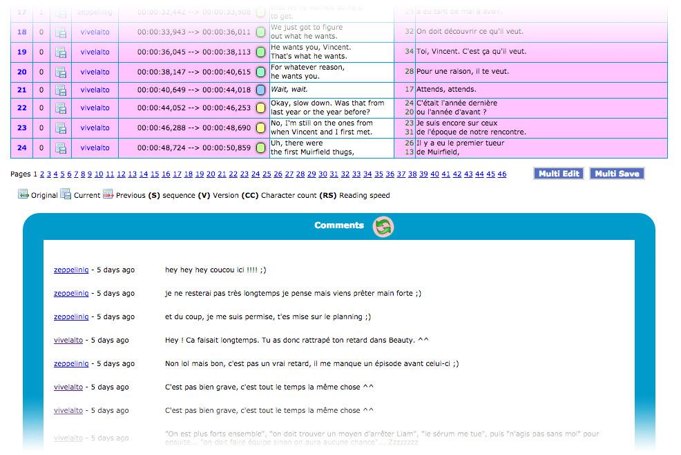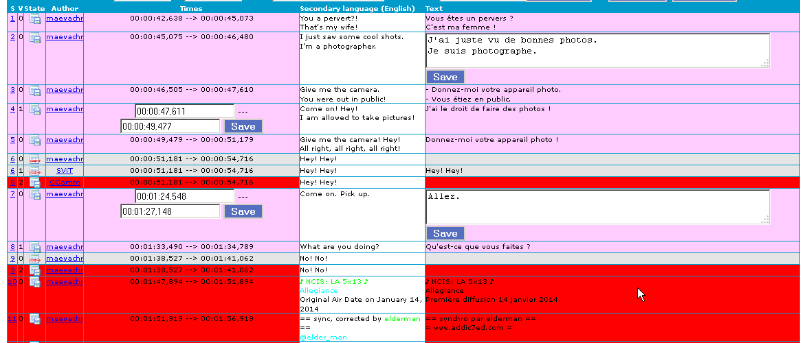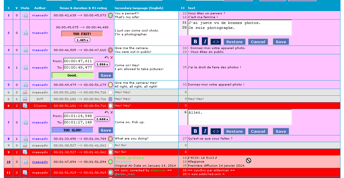 [UDPATE: 2016.01.09, for version 1.2.1] Hi, If you are an avid online translator on Addic7ed, you should install this extension—used by Addic7ed French users for more than a year now—to your web browser. A7++ An add-on for Addic7ed translators developed by @HitOrRun and @accent Two Addic7ed French users DOWNLOAD (version 1.2.1) Version 1.2.1 — 2016.01.09 release, Firefox 43 and up compatible : A7++_1.2.1_CHROME.crx — Double-click on the file, that's it. Or click in Chrome, select Settings then Extensions, drag and drop the file in that window. : A7++_1.2.1_FIREFOX.xpi — Click here to install: +Add to Firefox HOW TO SHORTEN YOUR TRANSLATION Some of you might already know those rules, but a reminder never hurt. Before translating, please understand the difference between a HI and a non HI subtitle. Remember that the purpose of a subtitle is not to deliver a literal translation of the original version. The audience, with the help of the sound, the acting, the images, can understand the nuances of a dialogue. A bad subtitle is when the audience is riveted to the text. In short, be short. For non HI translation: Interjections such as "oh, ah, eh, uh, ugh, ha, ho, ew, ouch, wow, hm, hm-mm, ha, boom, psht, phew, etc." are not to be translated. People can hear them. Repetition should not be emphasized. A sentence such as "No, no, no, no, no!" can be translated as little with only two nos: "No, no!" Basic English words such as "OK, yes, yeah, no, hi, hello" can also be discarded. They are universal in most countries. Names of character can be discarded after one or two appearances at the beginning of an episode, and when they are clearly understandable by ear. For HI and non HI translation: Phatic expressions such as "I mean, so, just, like, well, now, yeah, but, I think, you know, you see, and, alright, right, etc."can also be discarded, especially when they are at the beginning of a sentence, "Yeah, but what do you want?" becomes"What do you want?" Hesitation, unless meaningful, are to be discarded: "I--I think I just have to do it" becomes "I think I just have to do it" or as demonstrated in the previous point: "I have to do it." You have to be able to deliver accurate translation without being literal, being able to rephrase a meaning is important: Example 1: - I mean, you know, it's just that, hum, I--I love you. can become: - But I love you. Example 2: Let's say we need to shorten this translation : - Let me remind you that the body has been found near Bayside's marina. The first step would be to do this: - We found the body near Bayside's marina. If the audience already know that they're talking about a body, it can become: - We found it near Bayside's marina. Now, if we still need to shorten the sentence, we need to proceed to a loss of information. The question would be which information is needed to remain comprehensible? The fact that the body has been found near the water (marina)? Or the fact that it was near Bayside? Of course, it will depend on the context. In the end, it could become: - We found it near the marina or - We found it at Bayside. Good luck!16 points