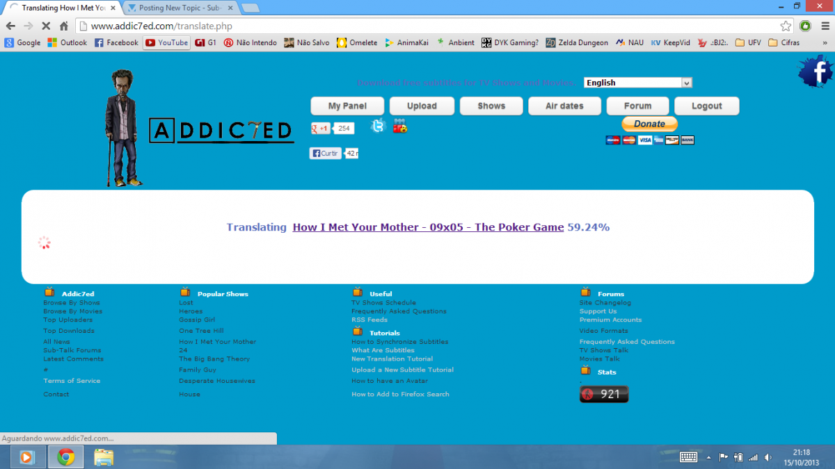 kelvin_ita Posted October 16, 2013 Report Share Posted October 16, 2013 E ai pessoal, tudo bem? Sou novo aqui no Addic7ed e resolvi a começar a ajudar a fazer legendas das séries que assisto. Mas então , recentemente eu ajudei a traduzir o episódio 9x05 de How I Met Your Mother, só que acabei sendo banido por não respeitar as normas de HI, que eu não sabia como funcionava. Só que eu conversei com o admin e tal e ele me desbaniu, e tenho que arrumar a legenda, só que agora quando tento entrar na página de tradução e depois clicar em Join Translation e selecionar a língua a página de tradução fica carregando eternamente. Alguém tem ideia de como posso arrumar isso? E outra dúvida, toda a tradução que eu tinha feito antes (40% do episódio) desapareceu, eu vou ter que começar a traduzir desde o zero ou tem como recuperar? Enviei em anexo uma imagem da página que está agarrada. Obrigado, e estou no aguardo de uma resposta. Hello guys, are you okay? I'm new here on Addic7ed and I started to help translating the subtitles of the series that I watch. But, recently, I helped translating a episode of How I Met Your Mother (9x05), but I got banned because I didn't respected the HI rules, cause I didn't knew how it worked. So I talked with the admin and he got my ban off, and I need to fix the subtitle, but now when I try to enter in the translation page, after clicking Join Translation and selecting the language, the page don't stop loading. Someone have any idea of what it might be? And another doubt, all the translation I did before (40% of the episode) is gone, I need to restart from the scratch or there is a way to recover it? I sent attached to the post a photo of the page that isn't working. Thanks, and I'm waiting for an answer. Link to comment Share on other sites More sharing options...