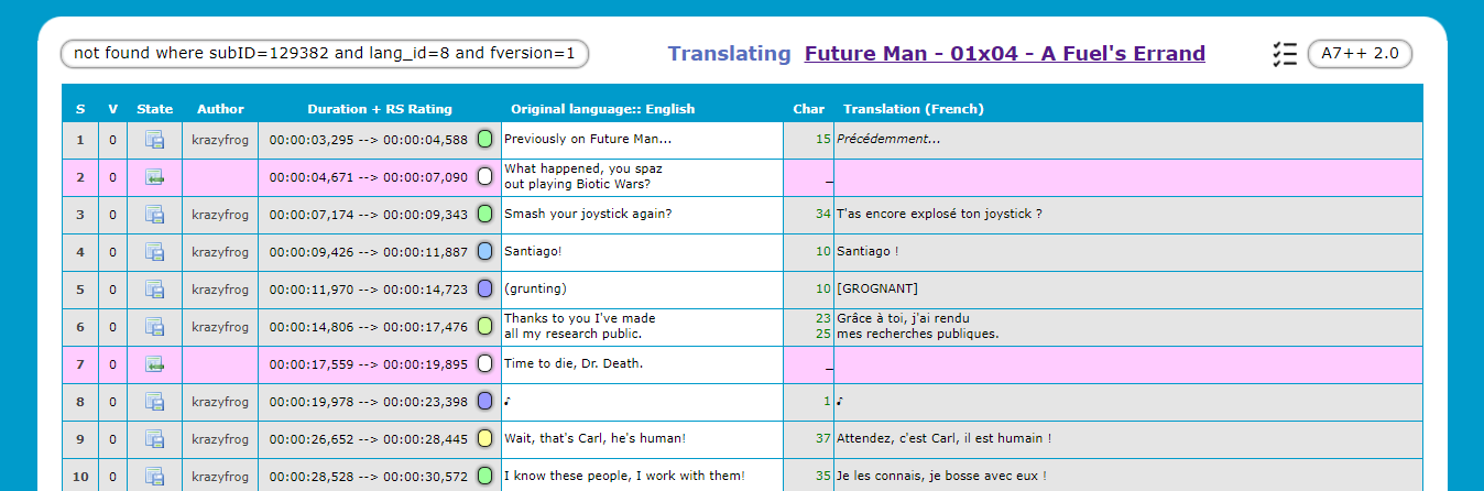 Hellie Posted November 24, 2017 Report Share Posted November 24, 2017 Salut à tous, Un petit souci sur Future Man, j'essaie de lancer la traduction en HI de l'épisode 1x04, d'ailleurs, krazyfrog l'avait déjà fait, semble-t-il, mais la traduction n'apparaît pas sur la page d'accueil de l'épisode. Et ça donne ça quand on est sur la page de la trad : Peut-être un bug ou une suppression, je ne sais pas, enfin si quelqu'un pouvait m'aider, ce serait super. Merci d'avance Link to comment Share on other sites More sharing options...