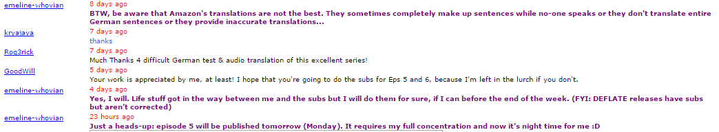 Yes, episodes 5 and 6 are on our schedule, I haven't forgotten about them. The reason why it is taking so long is because Amazon's subs are not so great. Many punctuation issues, line cut, italics not included that need to be added, line-by-line sync (for both German and English), and the translation... (see picture) So, it requires for me to double check everything for the English sub, hence taking a while.