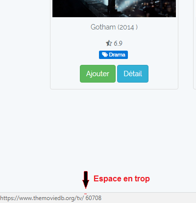 Par exemple, en cherchant n'importe quelle série (ici Gotham), si on clique ensuite sur "Détail", la redirection vers TMDb ne s'effectue pas car il y a une espace dans le lien qui se transforme donc en "%20" et le lien ne fonctionne pas.