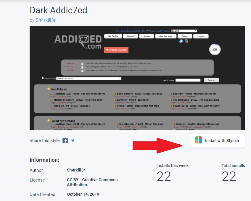 kinglouisxx Posted October 19, 2019 Report Share Posted October 19, 2019 Hi, @dc2257 Yes, because that's just a screenshot of the page where you need to click on the button You'll find the link in @sharkiller's post. Hi I made a Dark theme for Addic7ed.com that fix also a few alignment of images and lines. Is made for Stylus extension on chrome or firefox: https://userstyles.org/styles/176282/dark-addic7ed 4 Link to comment Share on other sites More sharing options...