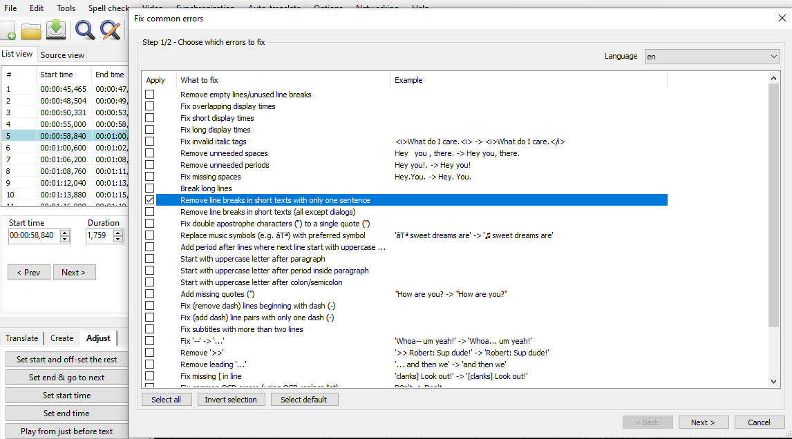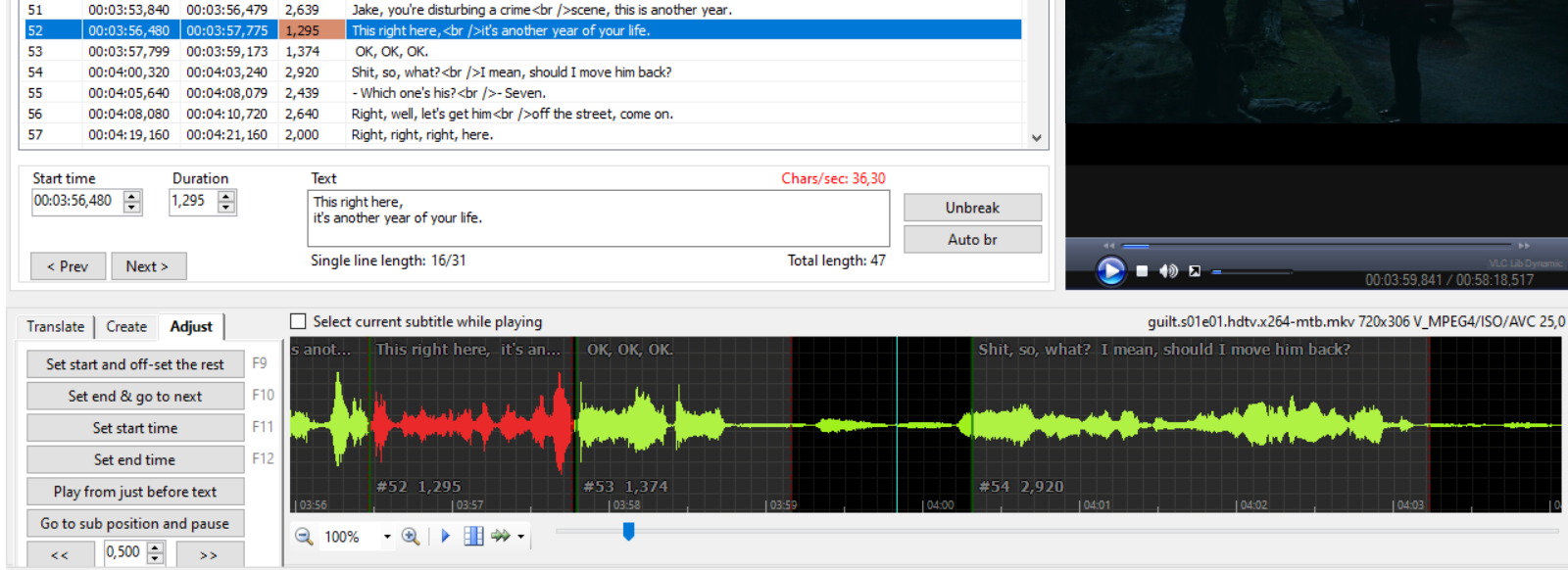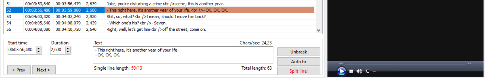 kinglouisxx Posted October 29, 2019 Report Share Posted October 29, 2019 Great job, @Shely85! For long lines in a dialogue, such as below, you'd need to split them and adjust the timings. The "split line" tool isn't always spot on, so adjustments may be needed. This would become something like this: The waveform is a useful tool, allows you to have a more accurate result. Otherwise, generally speaking, the recomended maximum length for a line is 40 char. You'll find all about our annoying but full of sense rules here: D. Is there rules to follow regarding how subtitles should be? Yes, there are. We don't accept raw subtitles on our site, which means that if subtitles have no corrections at all, we will delete them.They must be: - NO MACHINE TRANSLATED SUBS ON OUR SITE. - in capitalized case (names ought to be capitalized, no capitalization after commas or at the beginning of each new sequence...) - they don't contain long lines. Try to split them in half if they go over 40 characters. It's easier to read and doable in a few seconds with softwares like Subtitle Workshop, Subtitle Edit, Aegisub… No need to split them in half if they're below 40 characters per line. Valid for non dialogue lines mainly. Example: Sequence 1 In the meantime, we're trying to hold the regime in Khartoum change it to: Sequence 1 In the meantime, we're tryingto hold the regime in Khartoum - split sequences with long lines. Make it two lines on one sequence instead of a very long one. - no more than 2 lines per sequence for non dialogue lines. Same as above, split them so it's modified to 2 lines per sequence: Example: Sequence 1 In the meantime,we're trying to hold the regimein Khartoum change it to: Sequence 1 In the meantime, we're tryingto hold the regime in Khartoum - no 3 speakers per sequence. ONLY two maximum. - no dash on a line that isn't a dialogue. Example of what NOT to do: In order to tick the box "corrected" for your subtitles, in addition to the above specificities, it must contain all the dialogue dashes as well. One dash per line! If it doesn't fit, then your lines are too long. Example: - Text A - Text B And if you have dialogues that are very unequal, find a way to adjust them. Don't put a speaker with just one word, and the second speaker with a 50 character-sentence. It's common sense. No super long lines on sequences. If sequences go over 70 characters, find a way to resync them. The longer they are, the harder it is to read. Most of the above can be done easily with Subtitle Edit (Fix Errors is one of the way), and it's quick, so there's no excuses. You're responsible for the content YOU upload. You can resync our subtitles to fit other versions. However, never modify them, alter them (unless there's text errors, missing dashes...). Keep the credits intact. You can add a line for your resync credit. In the comments box of your upload, you can add a line to indicate you resynced it from X version. When uploading them, keep the same properties. If they're corrected/HD/HI, tick the appropriate boxes. See explanation below for the icons. Colored subtitles are allowed ONLY if you provide a non-colored version. They must be named "VERSION.Colored" to be differentiated by the system when downloading them. 1 Link to comment Share on other sites More sharing options...